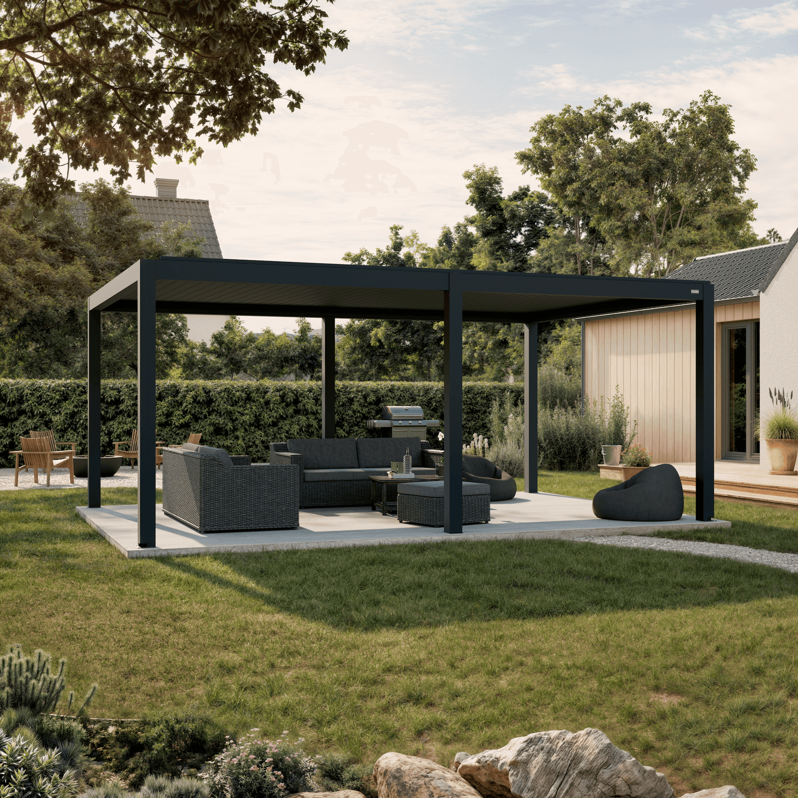 The pergola is only available in the dimensions 3x3m, 3x4m, 4x4m, 3x5m and 4x6m. These fixed standard dimensions allow us to offer first-class quality at an affordable price, as individual production would not be economical. The standard dimensions fit most customer needs and allow multiple pergolas to be combined – for example, two 4x4m pergolas for an area of 8×4 meters. This flexibility makes it possible not to cover the entire patio but to highlight specific areas, making the pergola not only a practical covering but also a stylish design element.