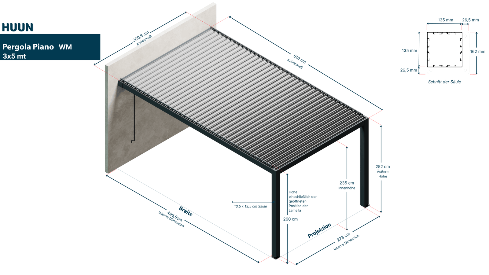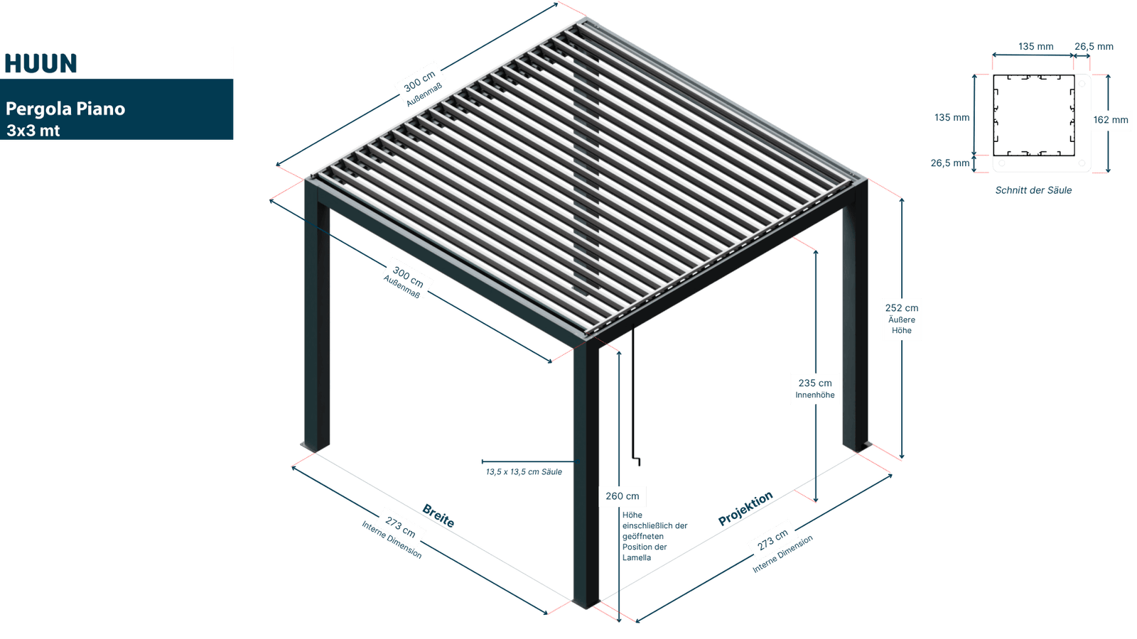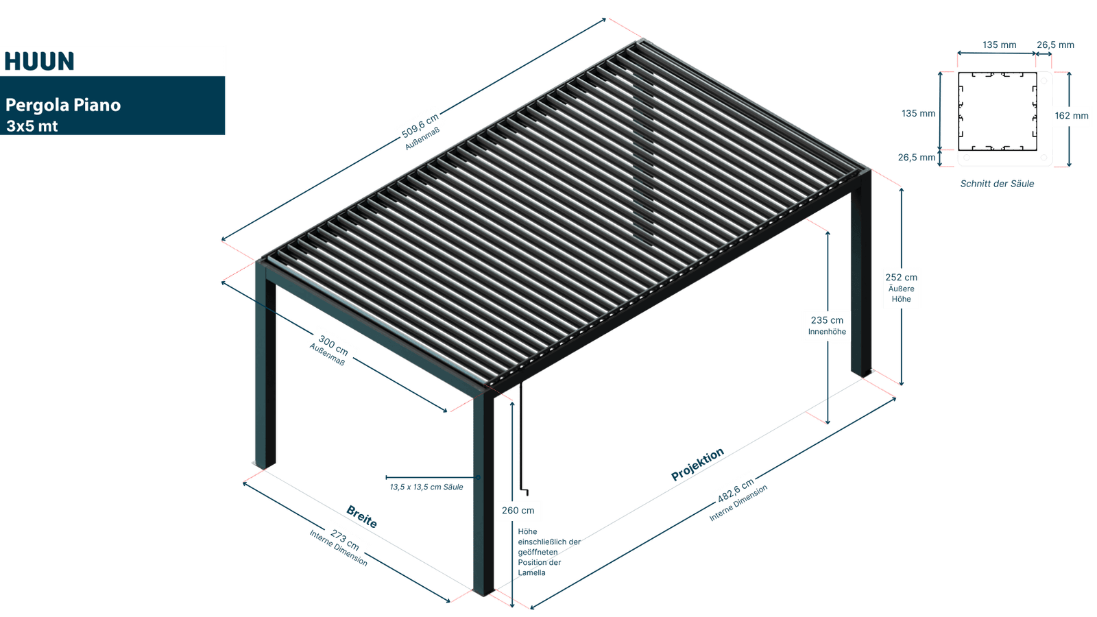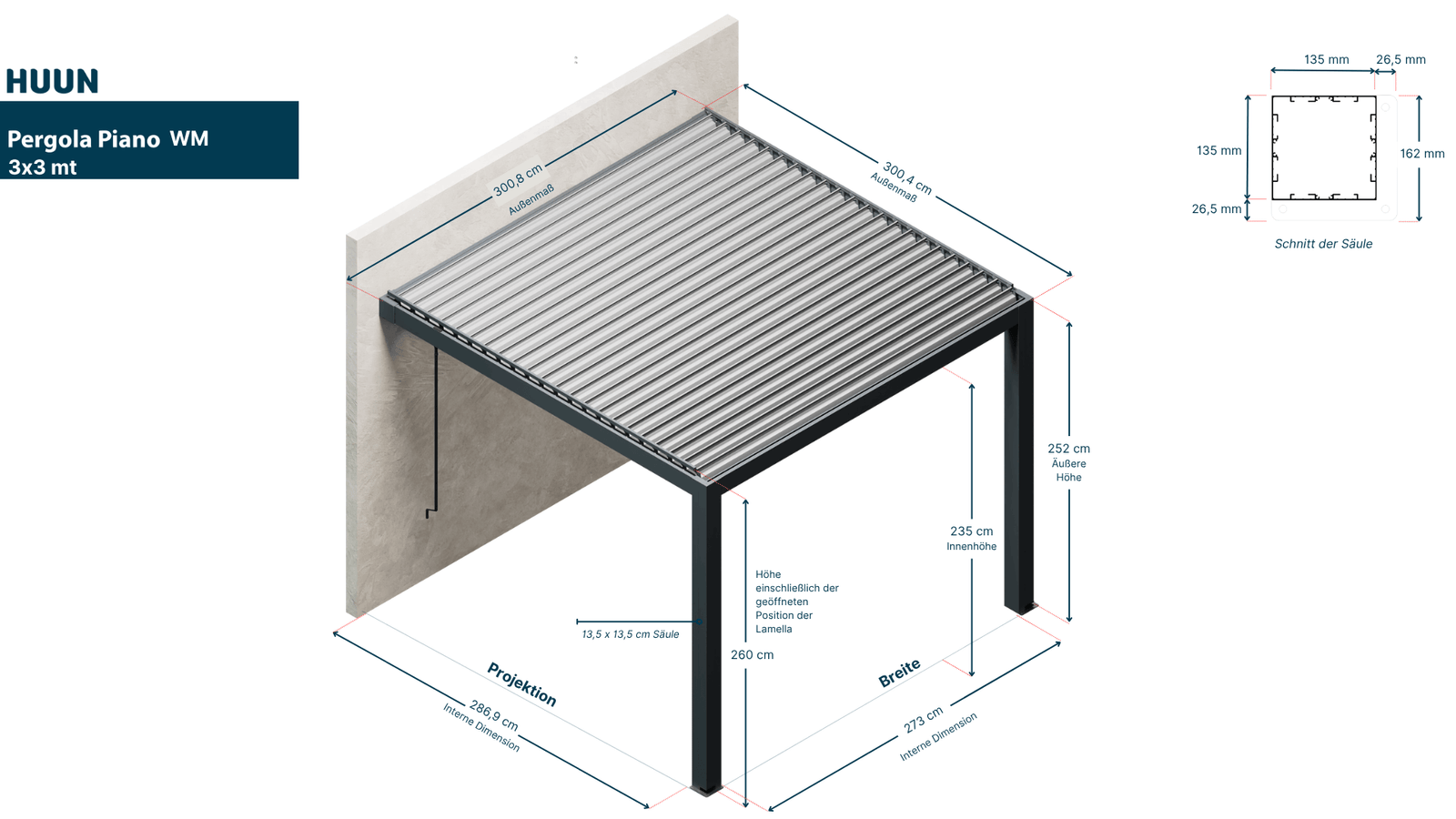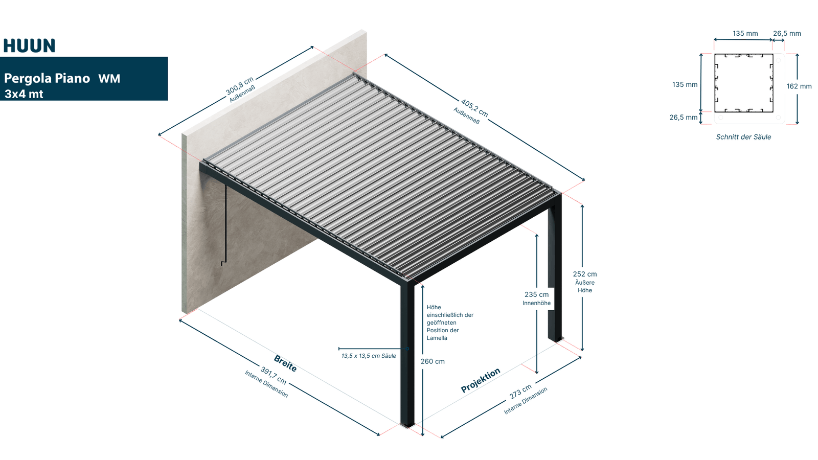 The pergola is available exclusively in the sizes 3×3 m (≈10×10 ft), 3×4 m (≈10×13 ft), 4×4 m (≈13×13 ft), 3×5 m (≈10×16 ft), and 4×6 m (≈13×20 ft). These fixed standard sizes allow us to offer top-quality pergolas at an affordable price, as custom-made options would not be economically feasible.